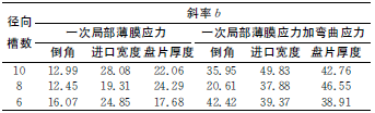 通過最小二乘法對各曲線進行線性擬合,獲得各擬合曲線的斜率b值,即可比較各參數(shù)在各自變化范圍內對應力的影響程度,見表4。由表4可知,在各參數(shù)給定范圍內,倒角對應力的影響最小,而盤片厚度和進口寬度對應力的影響較為接近。