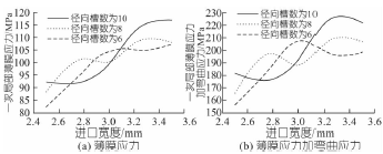 圖7 徑向槽數(shù)不同時進口寬度對應力的影響