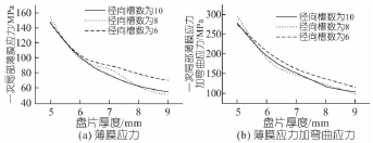 圖6 徑向槽數(shù)不同時盤片厚度對應力的影響