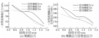 圖5 徑向槽數(shù)不同時倒角半徑對應力的影響