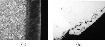 分別在調節閥桿端面上制備金相樣品,金相組織如圖3(a)、(b)所示。在金相樣品的邊緣觀察到氮化層,氮化層深為0。25~0。38mm,在氮化層邊緣及內部有許多微小的顯微裂紋,對調節閥桿的螺紋處進行腐蝕,發現螺紋處局部有氮化的痕跡,且被氮化的螺紋處大都有螺紋剝落發生,調節閥桿金相樣品的晶粒度都為4級,金相組織為回火索氏體。