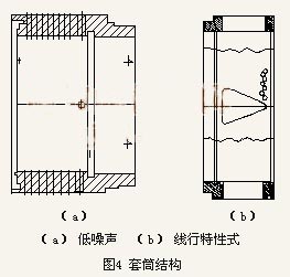 工業(yè)生產(chǎn)控制系統(tǒng)的多樣性決定了調(diào)節(jié)閥必須具備靈活的可調(diào)結(jié)構(gòu),軸流型調(diào)節(jié)閥要適應(yīng)現(xiàn)代工業(yè)的發(fā)展也必須具備此特點。套筒是為適應(yīng)高壓差,大口徑的管道需要而設(shè)計的一種流量節(jié)流零件。套筒閥因其獨特的導向穩(wěn)定性和易于實現(xiàn)高精度調(diào)節(jié)被廣泛使用,套筒閥的發(fā)明使原有閥門的流通能力提高了20%。套筒是為解決單座閥流通能力過低,不平衡力大而設(shè)計的一種結(jié)構(gòu),使用較廣泛。軸流型調(diào)節(jié)閥吸取了它的優(yōu)點,延用了此結(jié)構(gòu)。套筒(圖4)分為低噪聲式、線性特性式、等百分比式和低壓降比式等。