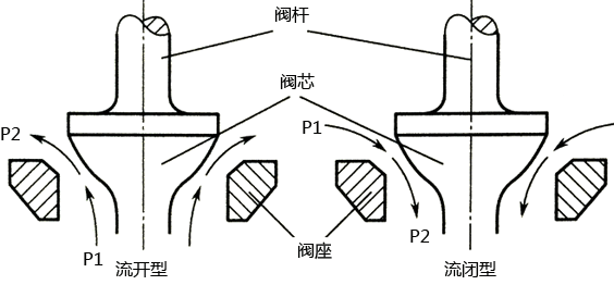 圖10-4 調節閥閥芯與介質流向示意圖
